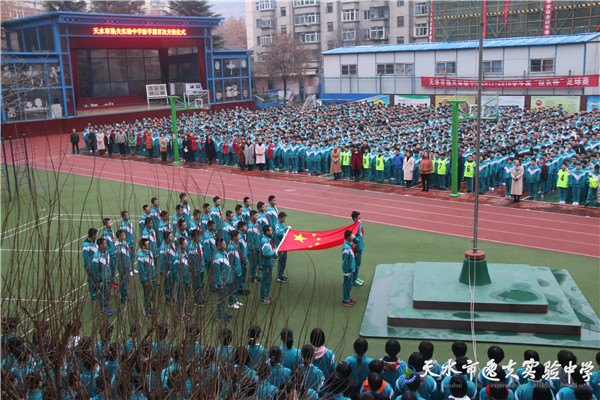 升旗仪式在嘹亮的奏唱国歌声中拉开了帷幕。接着,全体同学齐诵“经典记忆”《少年中国说》,将气氛推向高潮。学生代表、七年级六班夏毓泽同学向全校同学提出了六点希望,鼓励同学们在新的学期树立自信,迎来成功。教师代表、九年级副级长翟怀瑾老师告诉同学们,“一年之计在于春”,应当满怀期待和热情地迎来充满活力的新学期。最后,天水市教育局副局长、市逸夫实验中学校长沈建玲做了热情洋溢的开学致辞,她引用国家主席习近平在2018新年贺词中的一句话——“幸福都是奋斗出来的”开篇,呼吁全校师生在春天的脚步声中开启新的征程,胸怀家国天下,放眼民族未来,认真学习,厚积薄发,获得成长和成功,拥抱幸福和自豪。