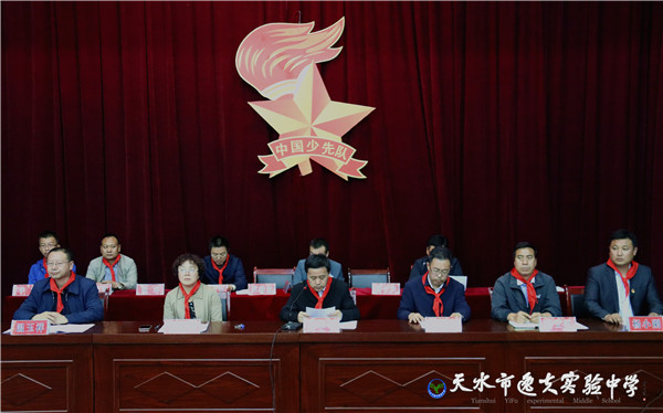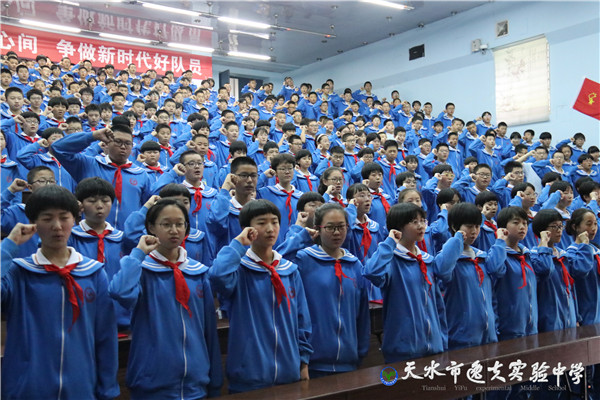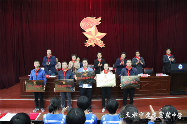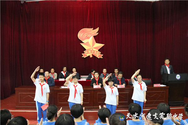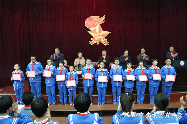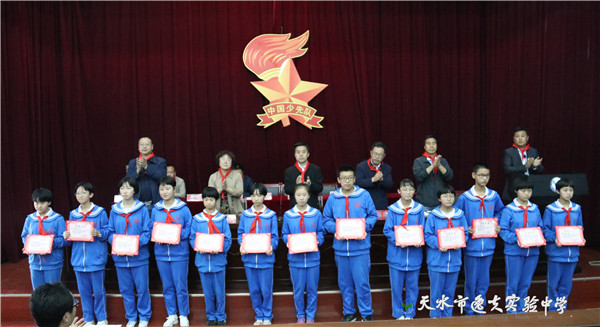 在高亢嘹亮的国歌声中,表彰大会拉开了帷幕。大会气氛庄严肃穆,首先由少先队员代表为校领导及少先队辅导员佩戴了红领巾,随后,优秀少先队员代表、七年级十二班丁凡晢等同学作了富有激情的献词。副校长周旭忠宣读了荣获“全国优秀动感中队”获奖班级和2018年天水市“最美红领巾”、“最美优秀少先队辅导员”、“优秀动感中队”表彰决定。副校长计卫珍宣读了bet36365备用网址2017—2018学年度“优秀少先队员”“优秀少先队干部”“优秀少先队辅导员”“优秀动感中队”的表彰决定。伴随着激昂的颁奖音乐,校领导为获奖集体及个人颁发了奖牌和证书。最后,bet36365备用网址党支部书记周和平作了重要讲话,周书记给全体少先队员提出了三点希望:希望少先队员们从小培养良好的人生观、世界观;希望少先队员们心怀梦想,努力奋斗;希望少先队员们在实践体验活动中勤学苦练、奋勇向前。